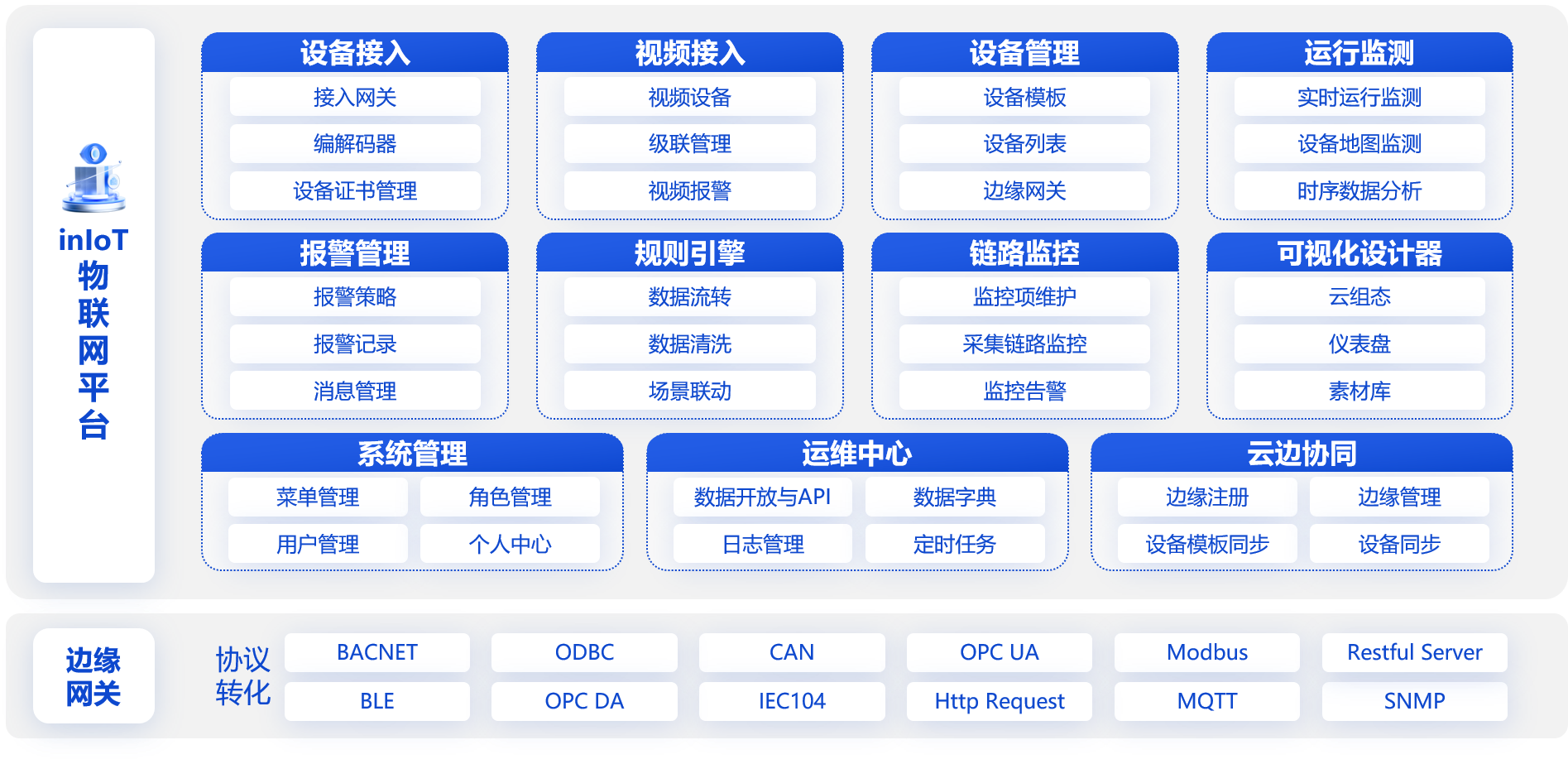 支持设备、仪表的标准通讯协议MQTT、TCP、UDP、CoAP、HTTP等;支持工业标准协议;支持视频标准协议;预置开放式协议库,支持私有协议解析。