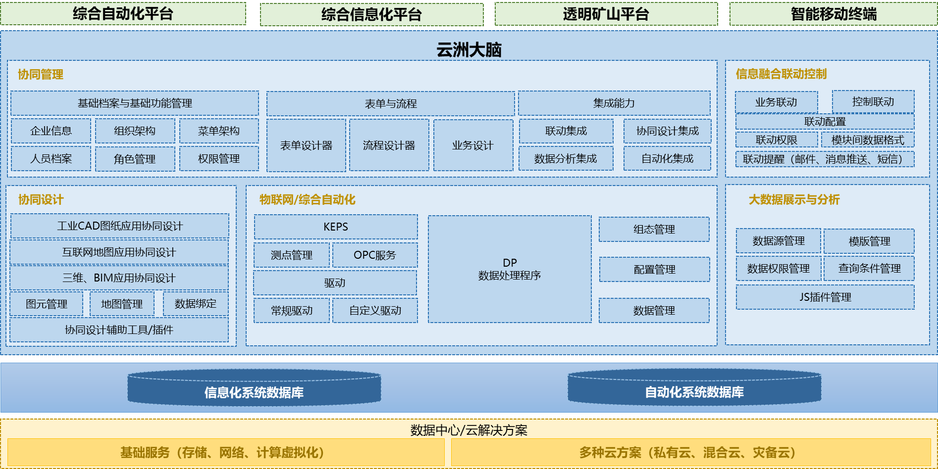 综合信息化平台:接入安全相关系统、信息化相关系统数据,融合综合自动化平台数据。顺利获得对各子系统的综合集成、纵向贯通、横向关联、融合创新,形成企业的安全、生产、经营、管理的综合性管控平台。 综合自动化平台:实现生产及生产辅助系统的接入、展示、控制、分析联动、数据转发等功能。实现在矿井调度指挥中心进行集中监控、集中调度指挥,并实现管控一体化。