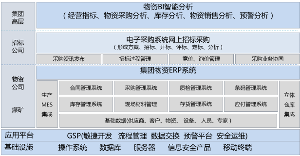 煤炭企业在生产经营中所需资金密集度大、所用物资种类繁多,辅助材料消耗大,原煤本身没有直接材料消耗,但其生产过程需要消耗大量的辅助生产材料,成本费用约占原-煤产品成本的1/4;如何发挥集团采购规模优势,实现对物资供应链的可控化管理成为关键。矿业集团的供应链管理涉及集团公司与各矿上下级之间的业务流程,需要实现煤矿从采购计划、采购订单、验收入库、仓库管理、领料出库、结算等业务全过程管理,需要实现集团内各公司之间的业务协同、标准规范的统一、各单位业务实时监管。
